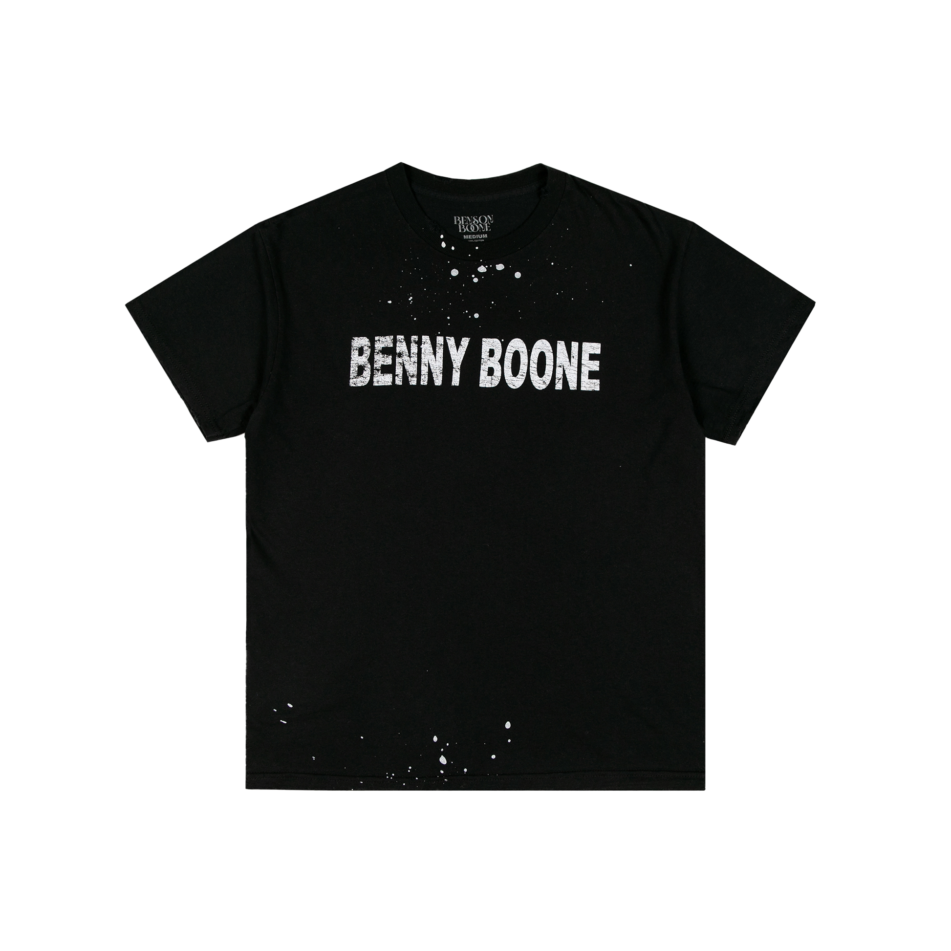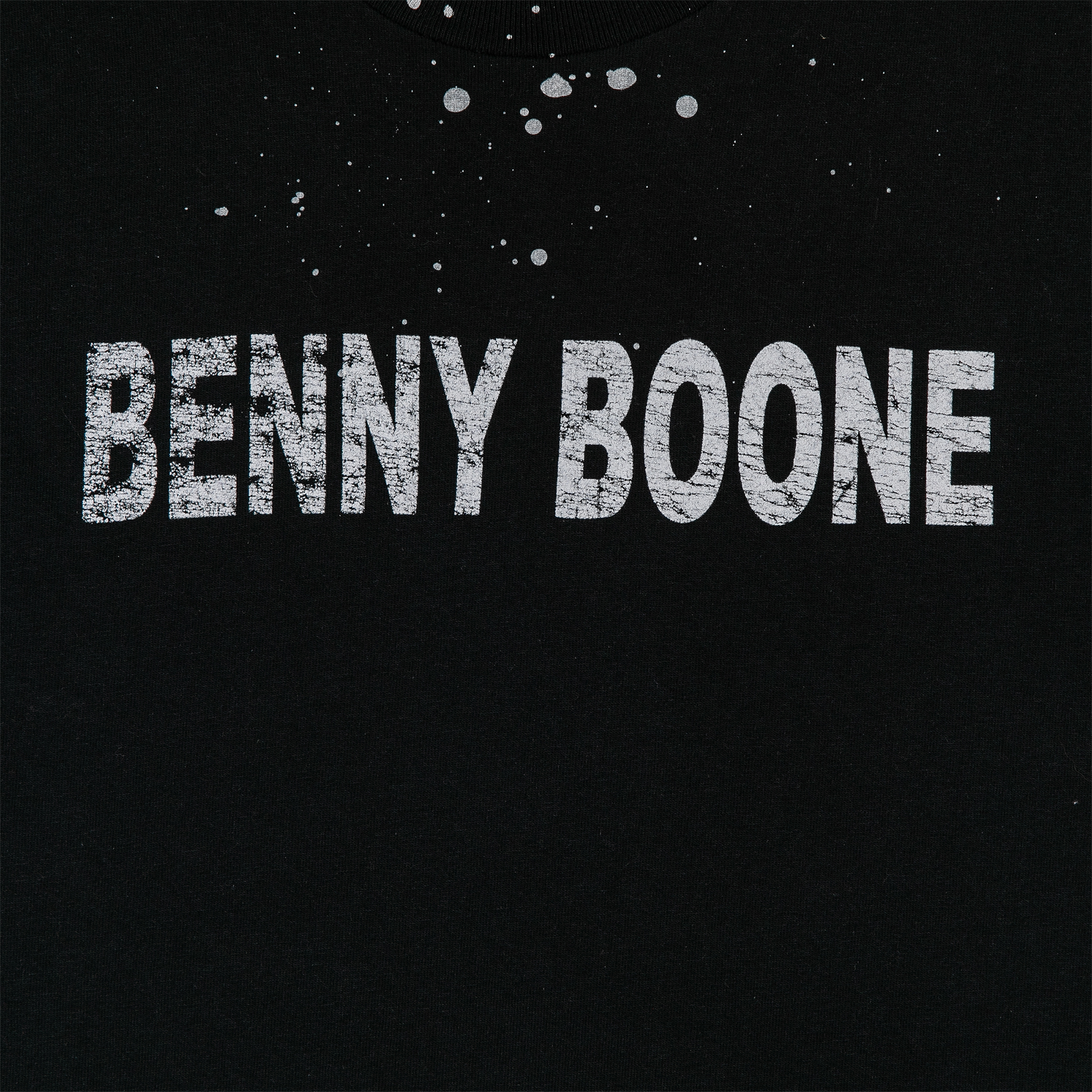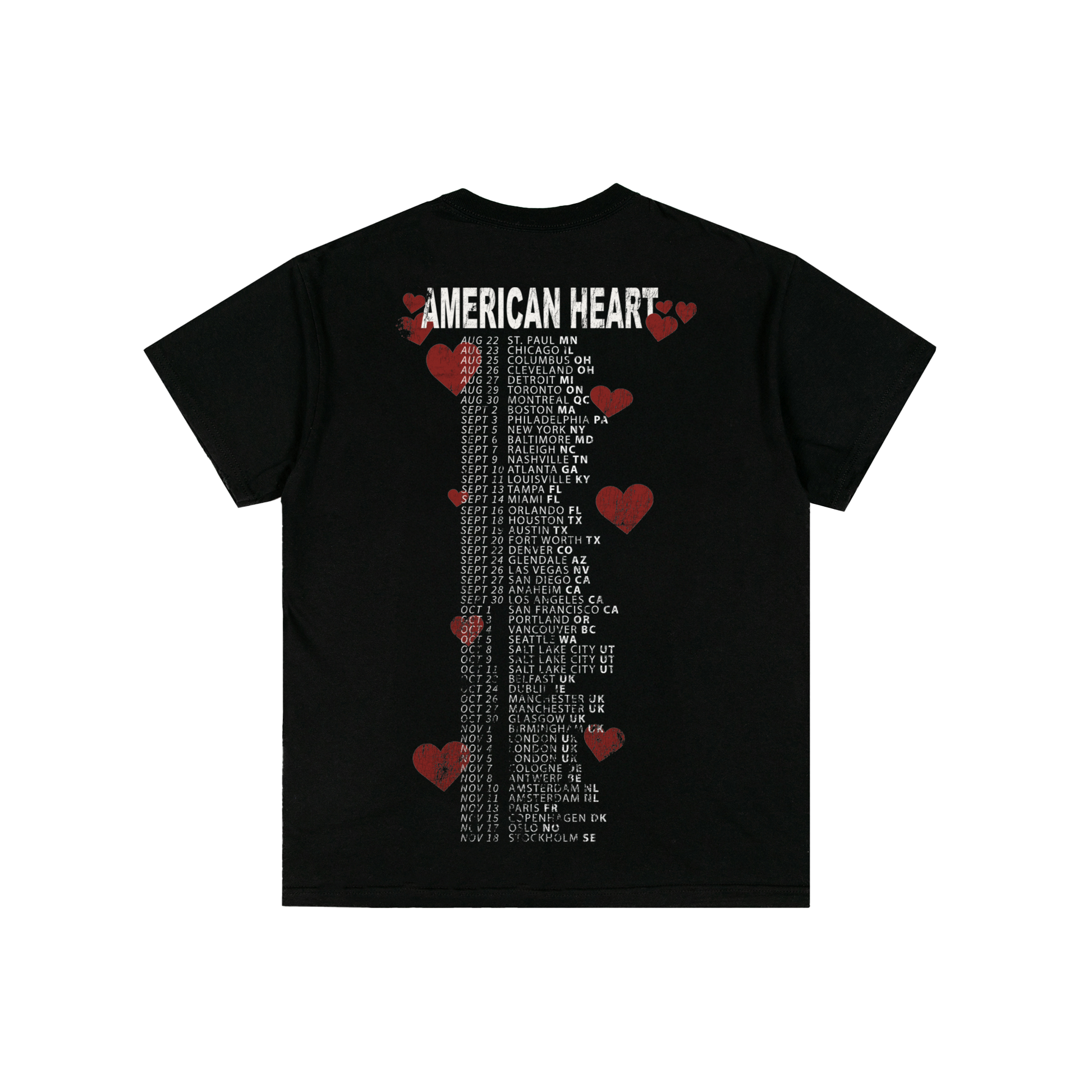 A vintage black unisex tee featuring logo design printed on the front, along with tour dates and heart graphic on the back. Front of tee also features splatter print beneath the neckline and above the bottom hem.