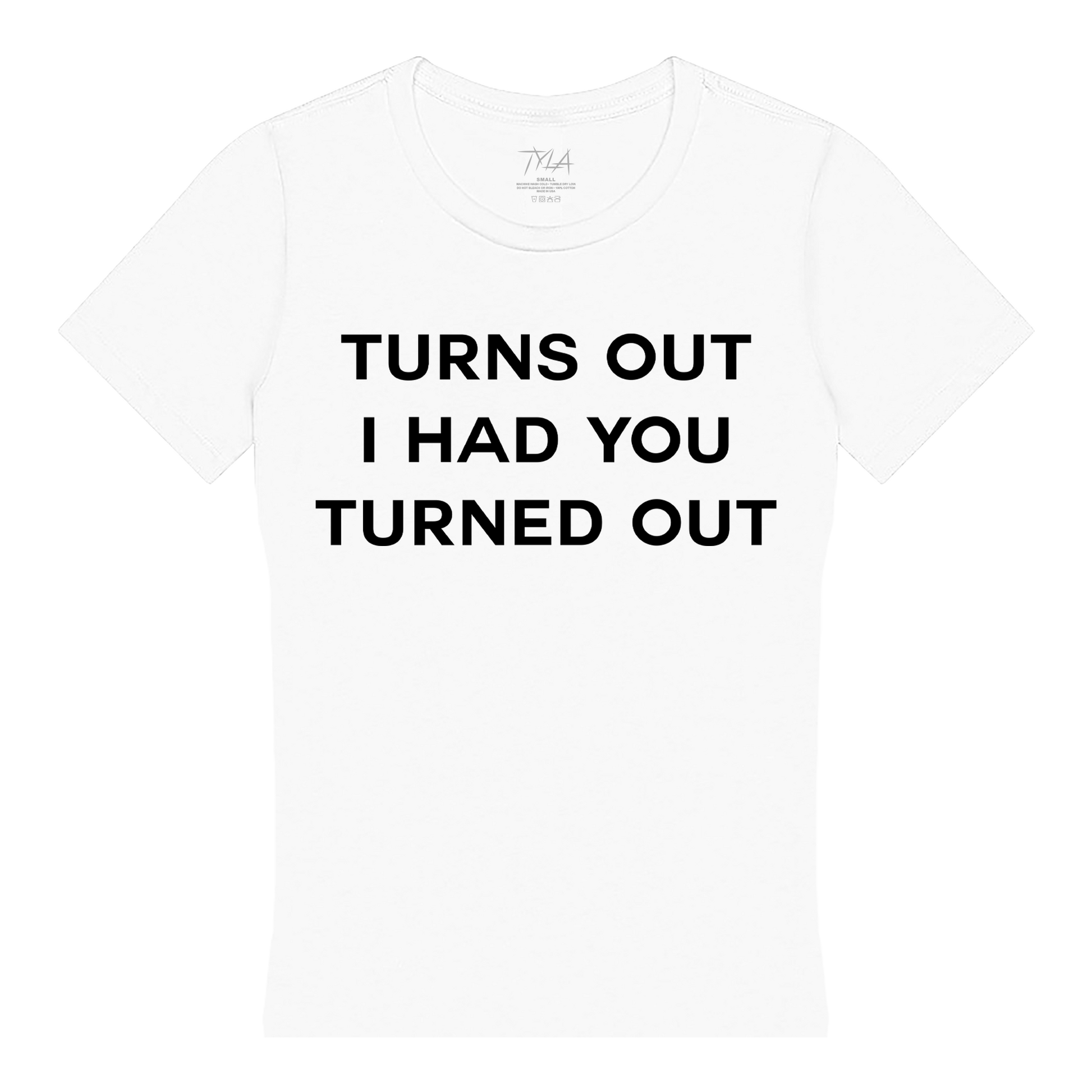 White fitted tee featuring Tyla Chanel "TURNS OUT I HAD YOU TURNED OUT" screen-printed graphic.